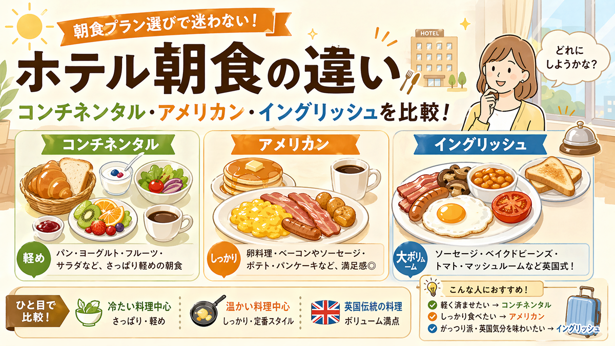 どちらを選ぶべきなのか?コンチネンタル・ブレックファーストとアメリカン・ブレックファーストの違い、さらに混同されがちなイングリッシュ・ブレックファーストについても詳しく紹介していきます。
