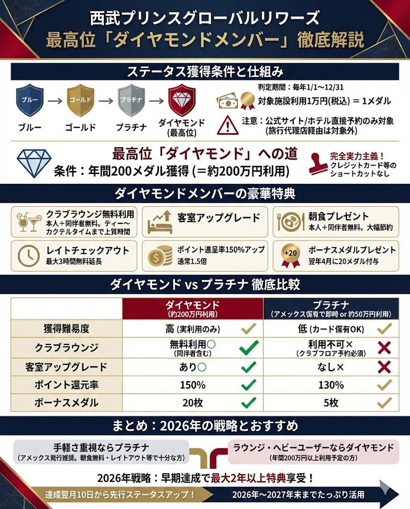 今回は、その中でも最高位となる「ダイヤモンドメンバー」を獲得するための条件や方法、そして豪華な特典内容について徹底的に解説していきたいと思います。さらに、アメックスプラチナなどのクレジットカードで簡単になれる「プラチナメンバー」との特典の差もわかりやすく比較していきます。